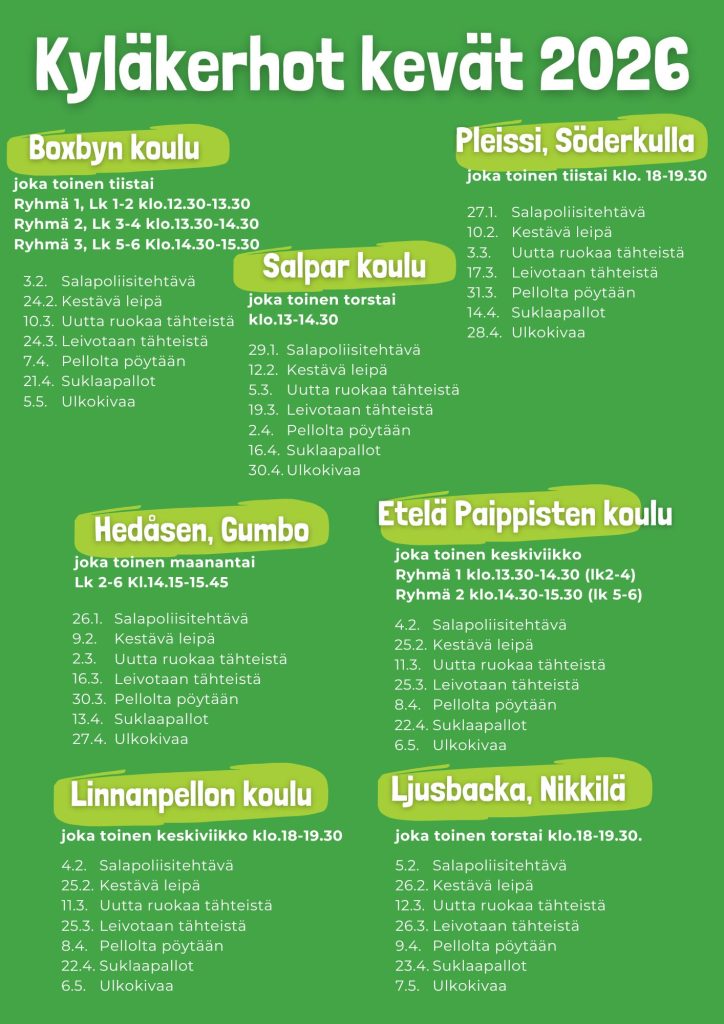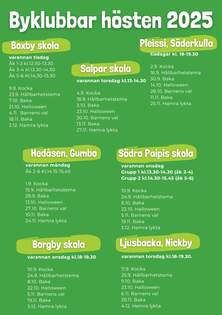 - Boxby skola (OBS, ändrad tid och dag fr.o.m. hösten 2025)
